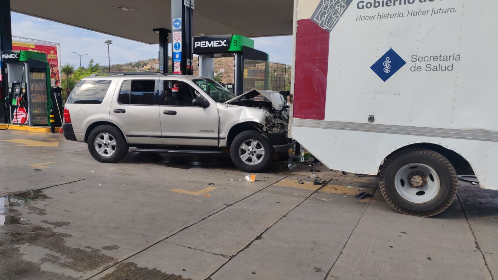 De acuerdo con los primeros reportes, una camioneta Ford Explorer, con placas del Estado de México, se estrelló contra una de las bombas de gasolina y, debido al fuerte impacto, también colisionó contra un vehículo oficial de la Jurisdicción Sanitaria 08 de Acatlán, el cual se encontraba estacionado en el sitio.