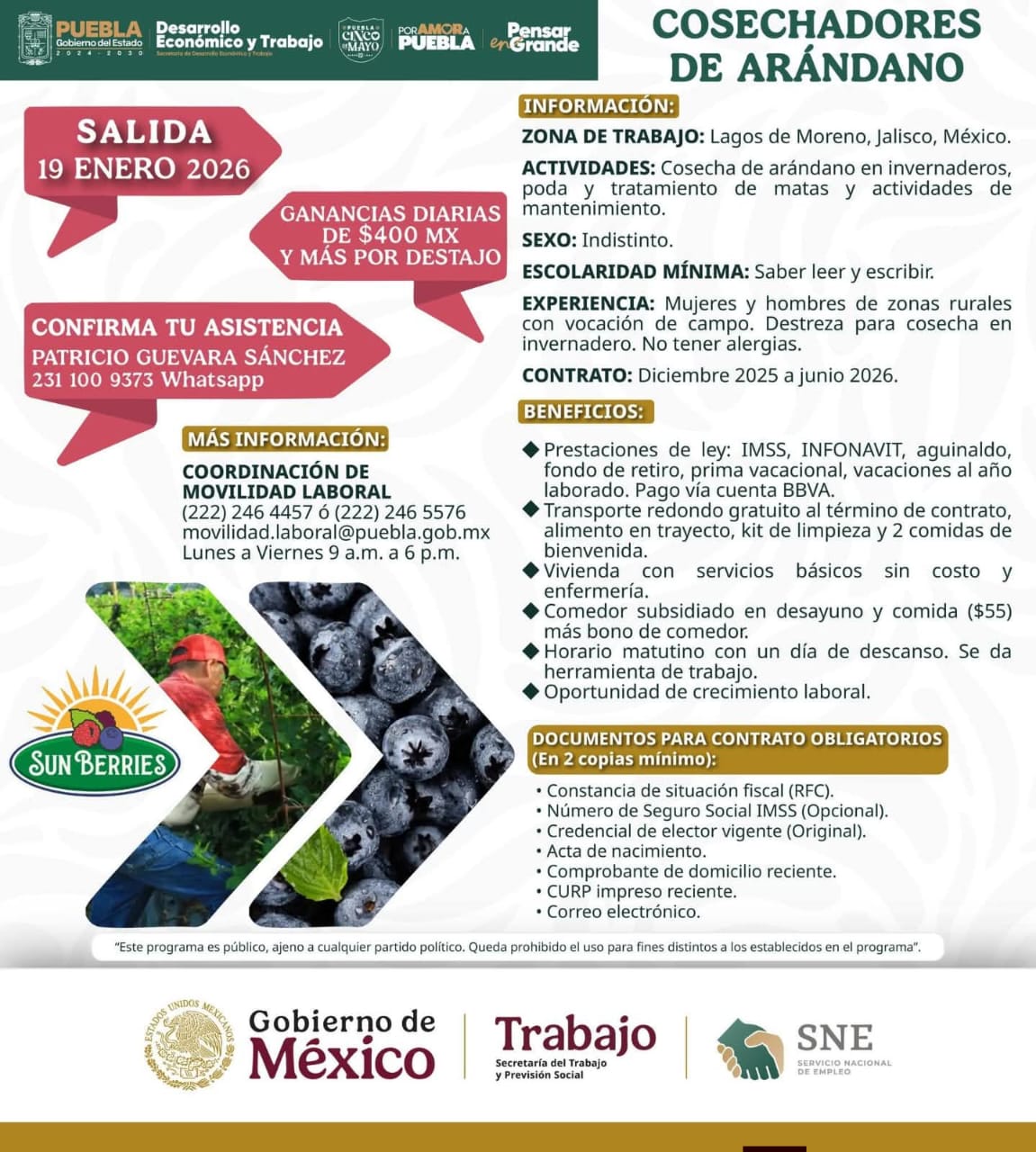 CHILA, Pue.- El Ayuntamiento Municipal de Chila de las Flores dio a conocer una oferta laboral dirigida a personas interesadas en trabajar como cosechadores de arándano en el estado de Jalisco, específicamente en el municipio de Moreno, como parte de una estrategia impulsada por el Gobierno Federal para fomentar el empleo rural.