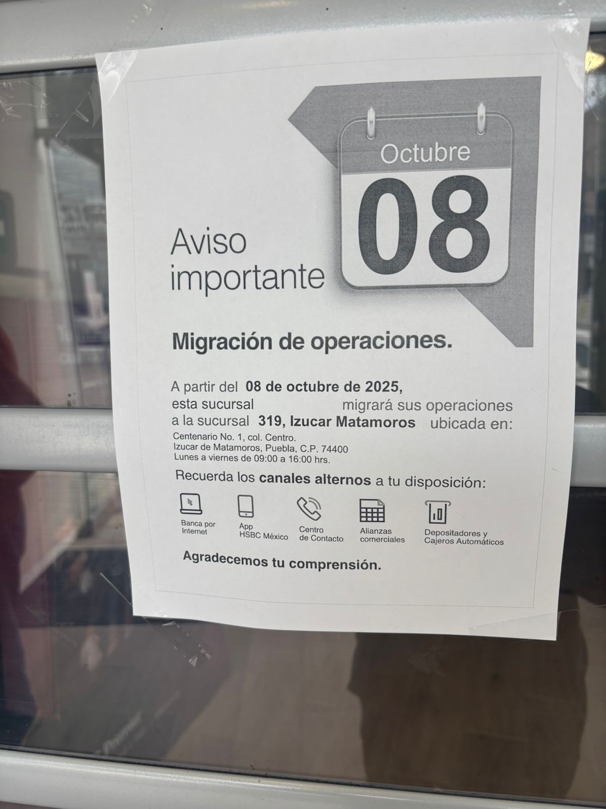 Según un comunicado emitido por la propia institución financiera, las operaciones de la sucursal en Acatlán fueron migradas a la sucursal 319 de Izúcar de Matamoros, ubicada en Calle Centenario #1, Colonia Centro, donde se brindará atención al público de lunes a viernes, en un horario de 9:00 a 16:00 horas.