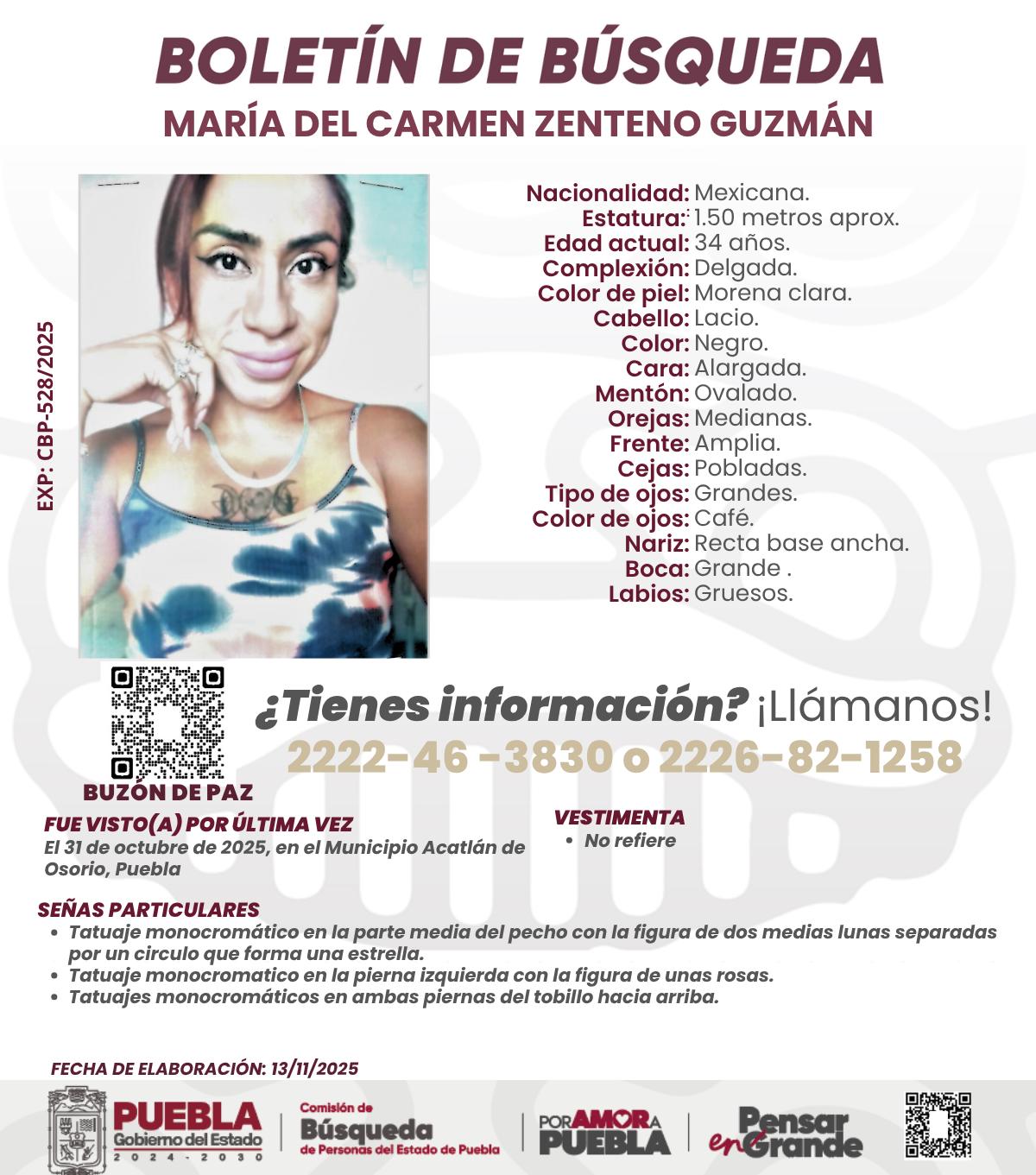 La familia aclaró que María del Carmen fue vista por última vez en Acatlán de Osorio el pasado 31 de octubre de 2025 y, hasta el momento, continúa sin ser localizada. La nueva ficha ya fue emitida con la información correcta.