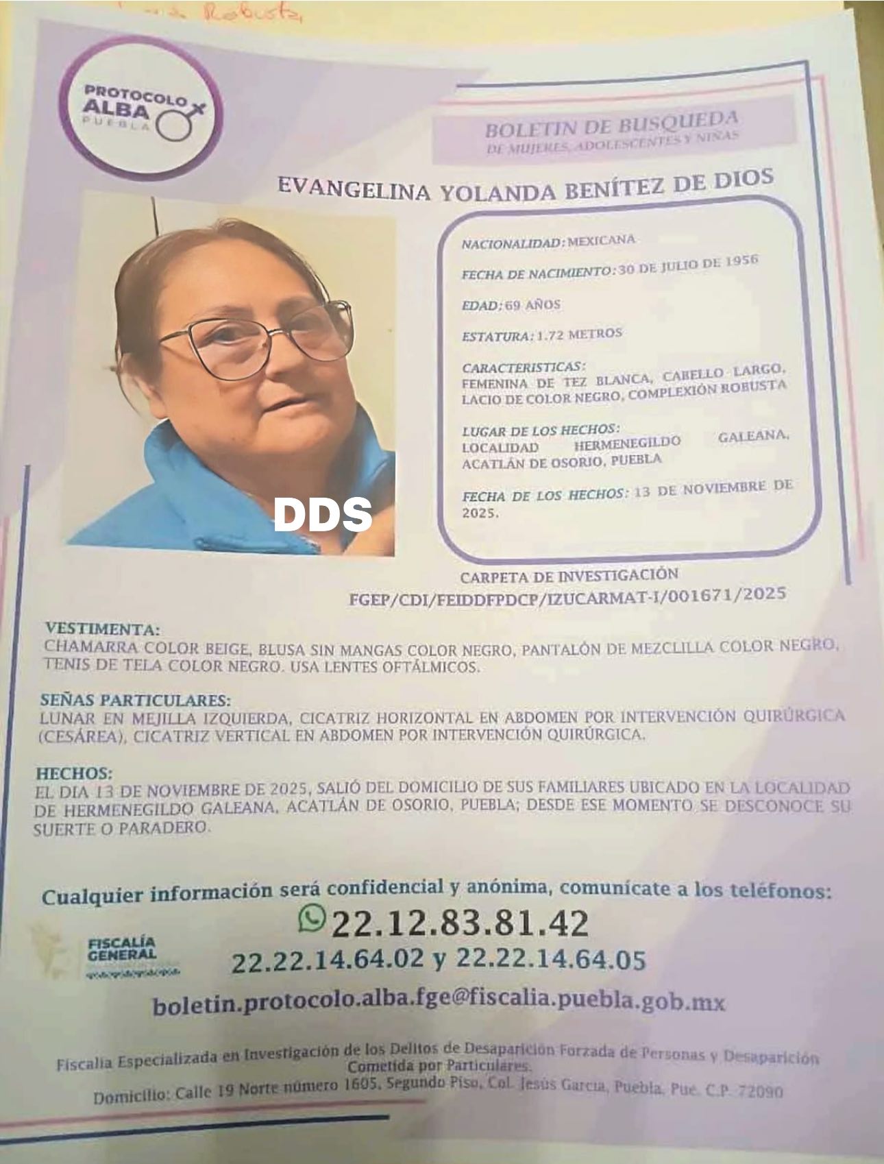Este caso se suma a la desaparición de María del Carmen Zenteno Guzmán, originaria también de Acatlán, reportada como desaparecida desde el 31 de octubre de 2025 en el municipio de Acatlán. María del Carmen, de 34 años, continúa sin ser localizada.