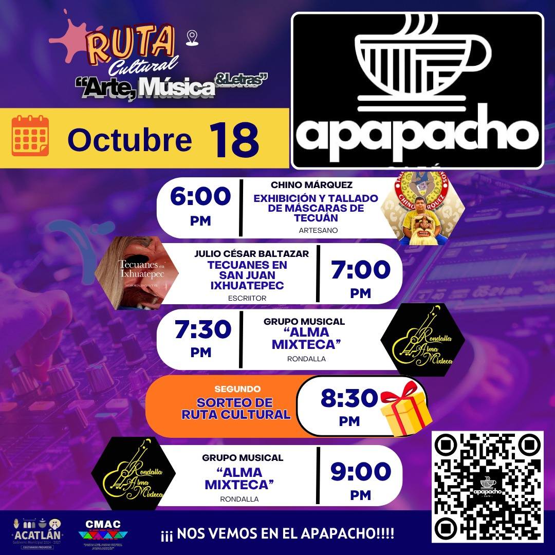 El primer día, jueves 17 de octubre, se presentará Laura Reyes “La voz de la Mixteca” a las 6:30 de la tarde; a las 7:30 se llevará a cabo un conversatorio con el profesor Pascual Martínez, seguido del primer sorteo de la Ruta Cultural a las 8:30, y cerrará la jornada el profesor Eddie Corro a las 9:00 de la noche.