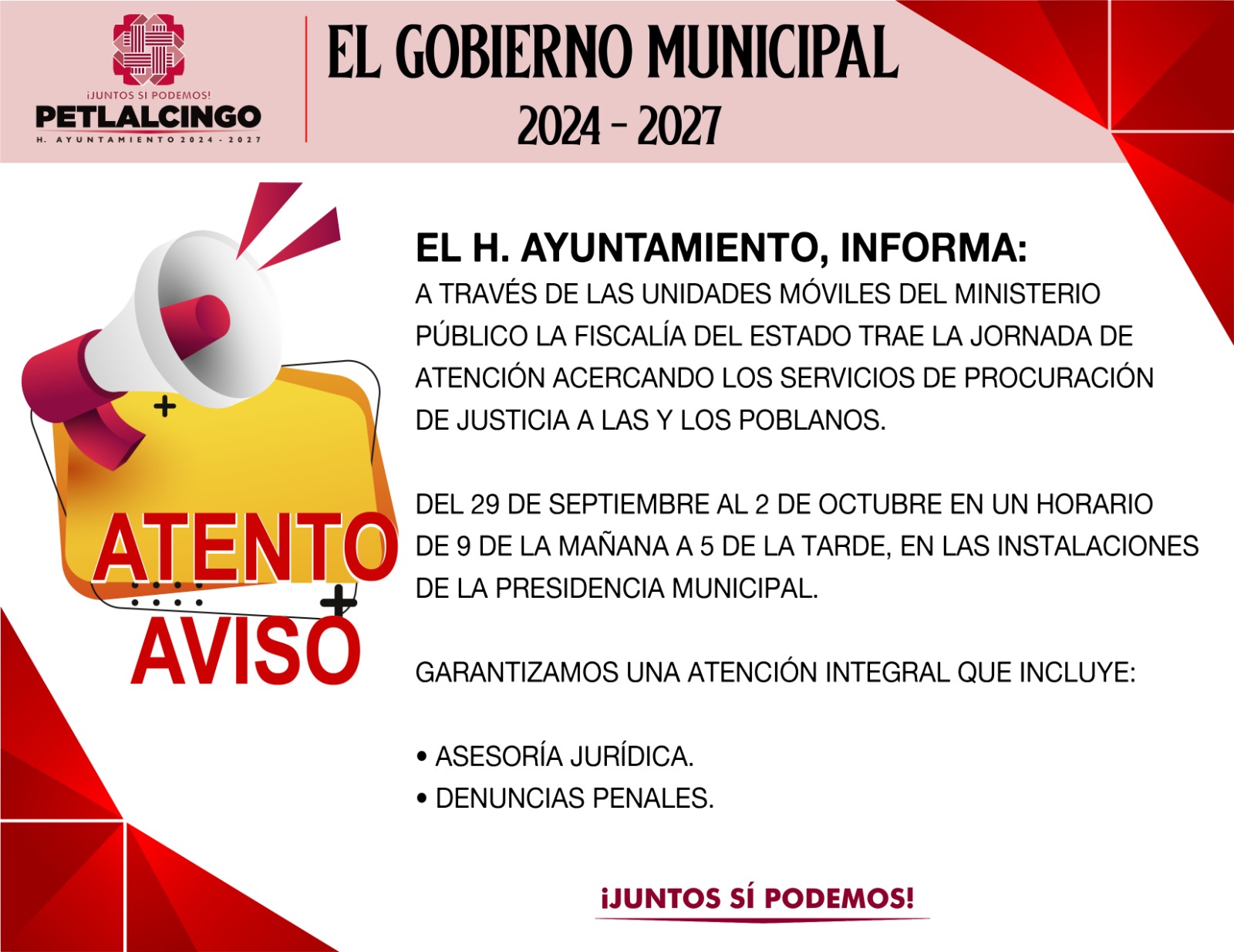 PETLALCINGO, Pue.-El Ministerio Público de la Fiscalía del Estado de Puebla lleva a cabo una jornada de atención ciudadana en el municipio de Petlalcingo, con el propósito de acercar servicios jurídicos y dar respuesta a las necesidades de la población en materia legal.