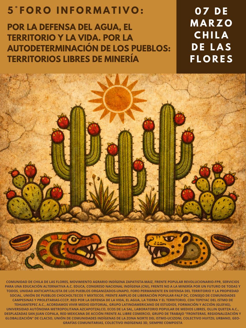 Uno de los momentos más relevantes del foro será a las 16:30 horas, cuando se realizará la declaratoria de Chila de las Flores como territorio libre de minería, con lo que se busca sentar un posicionamiento público en defensa del agua, el medio ambiente y la autonomía de los pueblos.